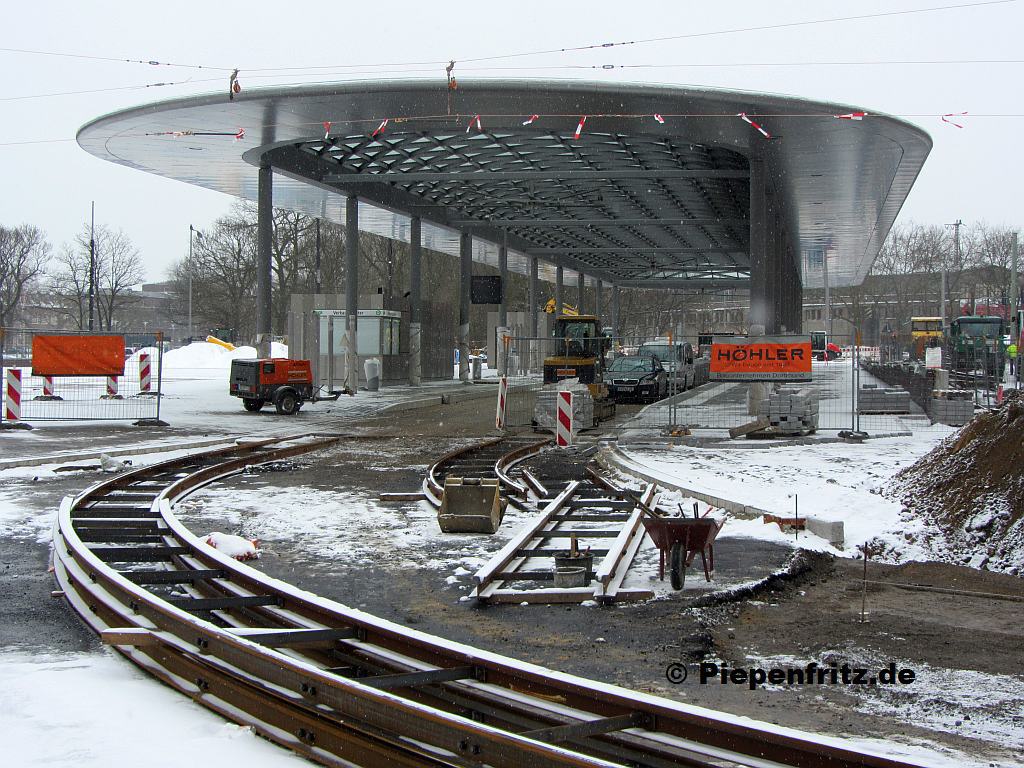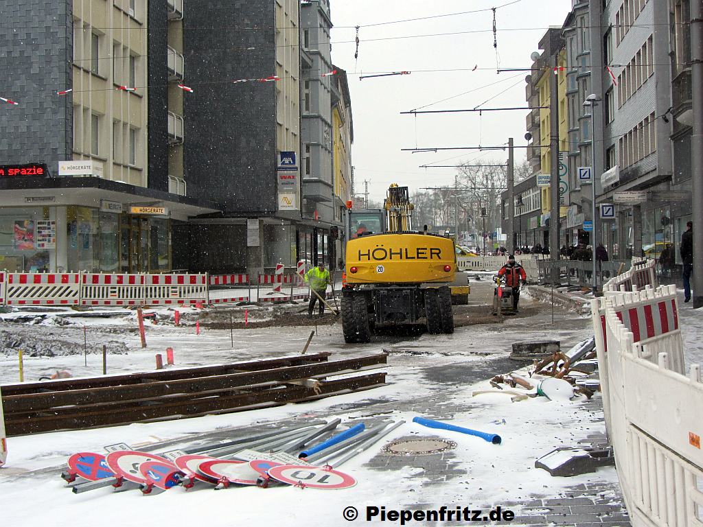Das letzte Baustück.. .. steht vor seiner Fertigstellung, wenn nicht das Winterwetter ständig für Verzögerungen sorgen würde. Jahre nach der Planung, dem ersten Bauabschnitt und der Beschleunigung der Strassenbahn steht die Grossbaustelle nun vor der Vollendung. Derzeit werden von der Hauptstrasse zum ZOB und vom ZOB zum Hauptbahnhof der Gleisweg erneuert, die Schienen der neuen Verkehrsführung angepasst.