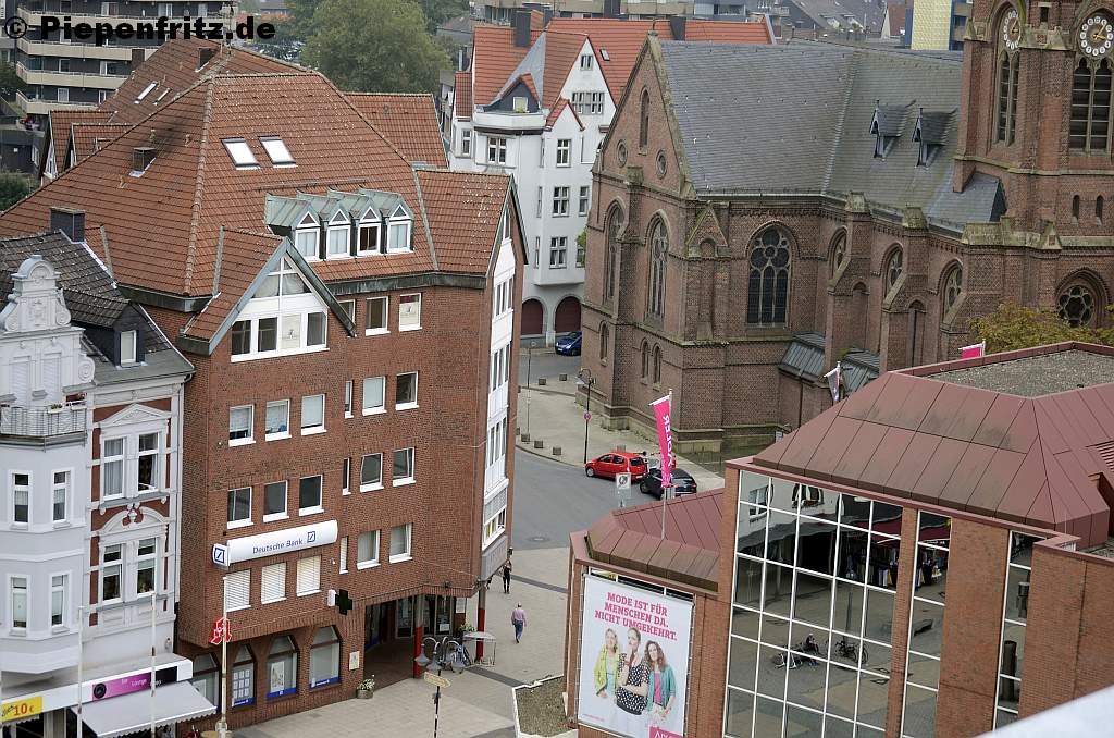 Bebelstrasse. Eines der ältesten Häuser, vom 2. Weltkrieg verschont, steht auf der Bebelstrasse mitten in der Innenstadt. Früher das Verlagshaus des Herner Anzeigers, beherbergt es seit Jahrzehnten die Buchhandlung Koethers und Röttsches. Hier zeigt sich der eher ungewöhnliche Baustil in der Herbstsonne des Jahres 2011, auch wenn der strahlend blaue Himmel eher auf Hochsommer hindeutet.